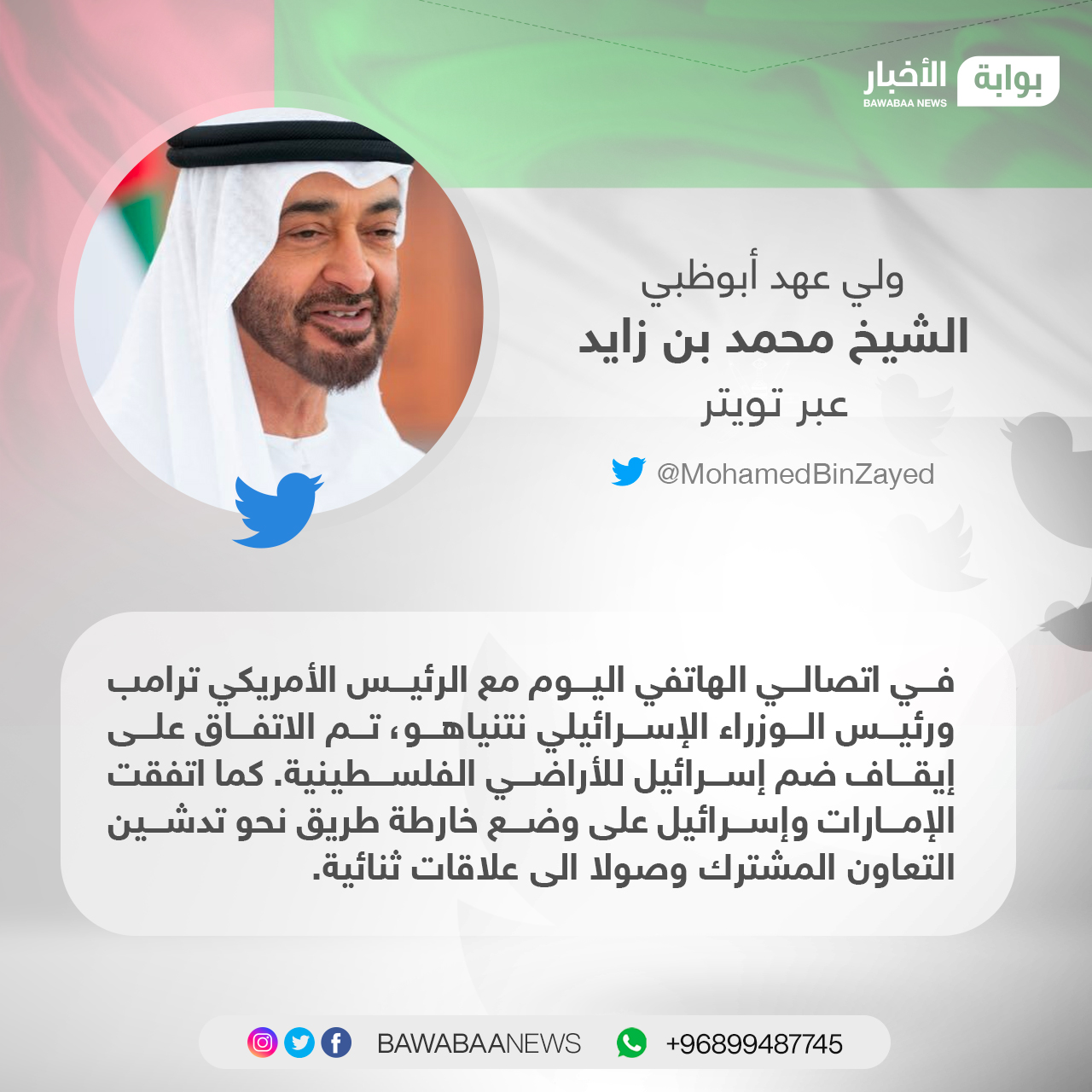 محمد بن زايد On Twitter في اتصالي الهاتفي اليوم مع الرئيس الأمريكي ترامب ورئيس الوزراء الإسرائيلي نتنياهو تم الاتفاق على إيقاف ضم إسرائيل للأراضي الفلسطينية كما اتفقت الإمارات وإسرائيل على وضع خارطة