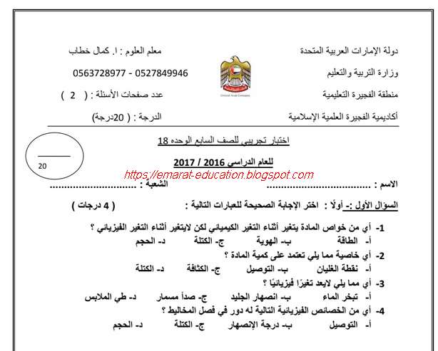 اختبار تجريبى فى مادة العلوم للصف السابع الفصل الدراسى الاول مدرستي الاماراتية