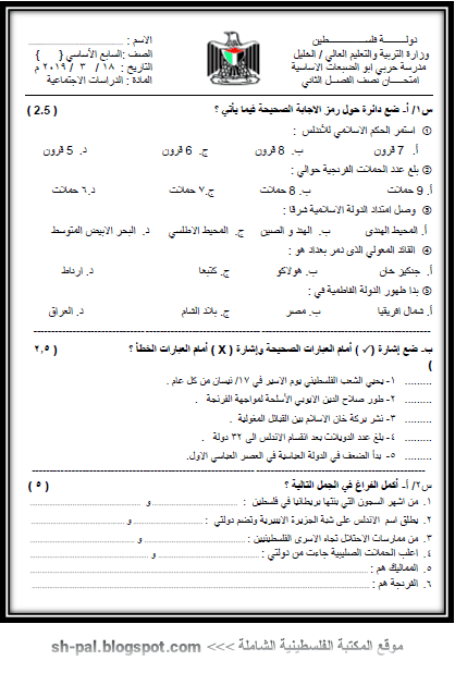 امتحان نصف الفصل الثاني في الدراسات الاجتماعية للصف السابع المكتبة الفلسطينية الشاملة