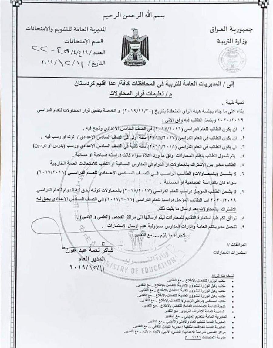 الكتاب الرسمي التعليمات الخاصة بتفعيل قرار المحاولات للعام الدراسي 2019 2020 وزارة التربية العراقية