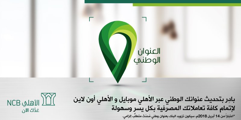 البنك الأهلي التجاري On Twitter باد ر بتحديث عنوانك الوطني عبر الأهلي موبايل و الأهلي أون لاين قبل 14 أبريل 2018 لإتمام كافة تعاملاتك المصرفية بكل يسر وسهولة Https T Co 0zrcg91ojz Https T Co Przu58lsui