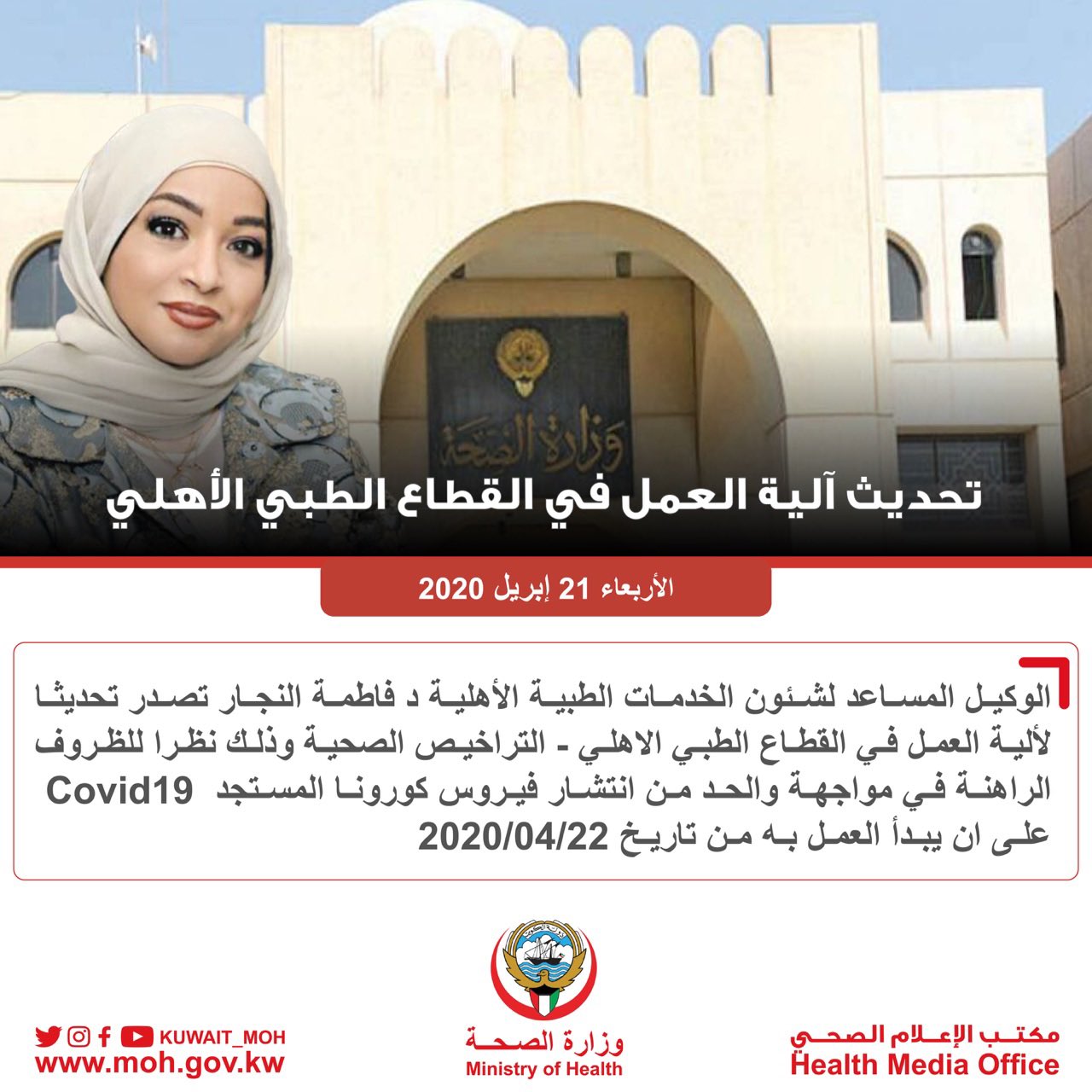 وزارة الصحة الكويت On Twitter الوكيل المساعد لشئون الخدمات الطبية الأهلية د فاطمة النجار تصدر تحديثا لألية العمل في القطاع الطبي الأهلي التراخيص الصحية وذلك نظرا للظروف الراهنة في مواجهة