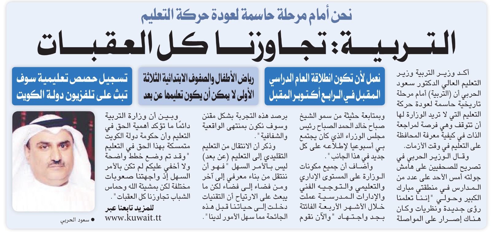 جريدة الجريدة الكويتية وزارة التربية ندرس تطبيق التعليم عن ب عد العام الدراسي المقبل