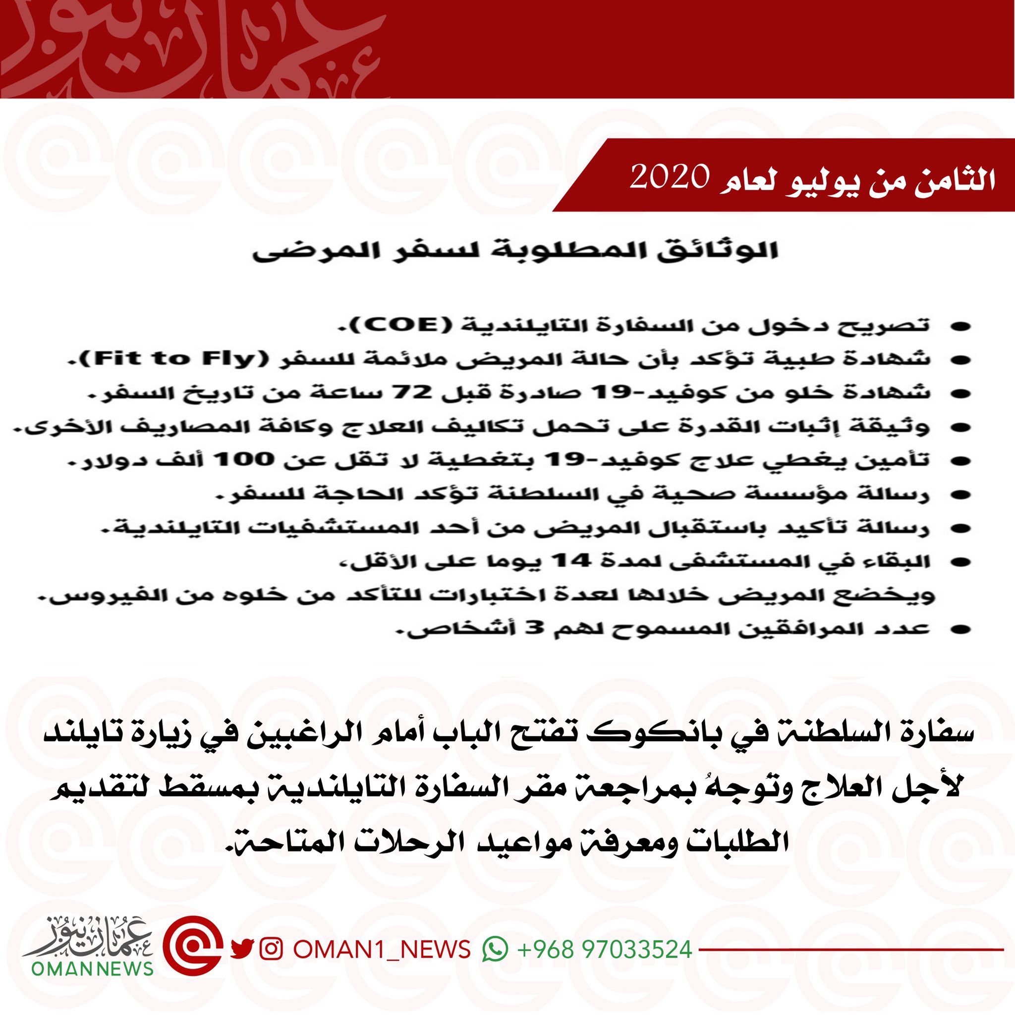 ع مان نيوز سفارة السلطنة في بانكوك تفتح الباب أمام الراغبين في زيارة تايلند لأجل العلاج وت وجه بمراجعة مقر السفارة التايلندية بمسقط لتقديم الطلبات ومعرفة مواعيد الرحلات المتاحة