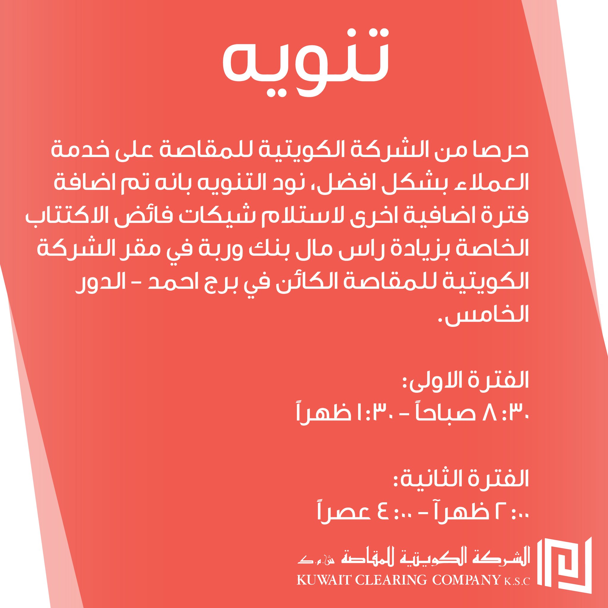 الكويتية للمقاصة Twitterren نود التنويه بانه تم اضافة فترة اضافية اخرى لاستلام شيكات فائض الاكتتاب الخاصة بزيادة راس مال بنك وربة في مقر الشركة الكويتية للمقاصة الكائن في برج احمد الدور