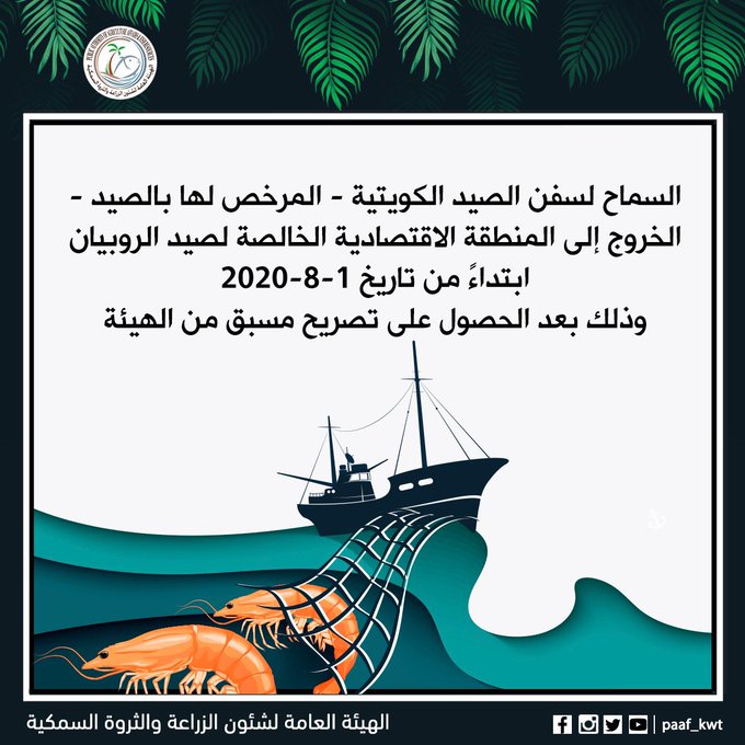 جريدة بوخالد نيوز الكويت الهيئة العامة لشئون الزراعة والثروة السمكية السماح بخروج سفن الصيد الكويتية لصيد الروبيان في المنطقة الاقتصادية الخالصة ابتداء من تاريخ ١ ٨ ٢٠٢٠ وفقا للقرار رقم ٧١٦ لسنة