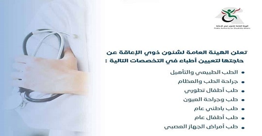 تعلن الهيئة العامة لشئون ذوى الاعاقة فى الكويت عن حاجتها لتعيين اطباء فى التخصصات التالية