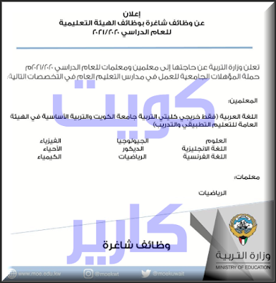 وظائف خالية في وزارة التربية الكويتية للعام 2020 2021م