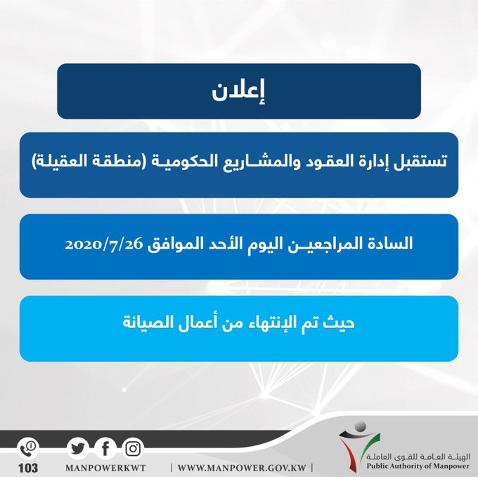 جريدة بوخالد نيوز الكويت الهيئة العامة للقوى العاملة تستقبل إدارة العقود والمشاريع الحكومية منطقة العقيلة السادة المراجعين اليوم الأحد الموافق 2020 7 26 حيث تم الإنتهاء من أعمال الصيانة