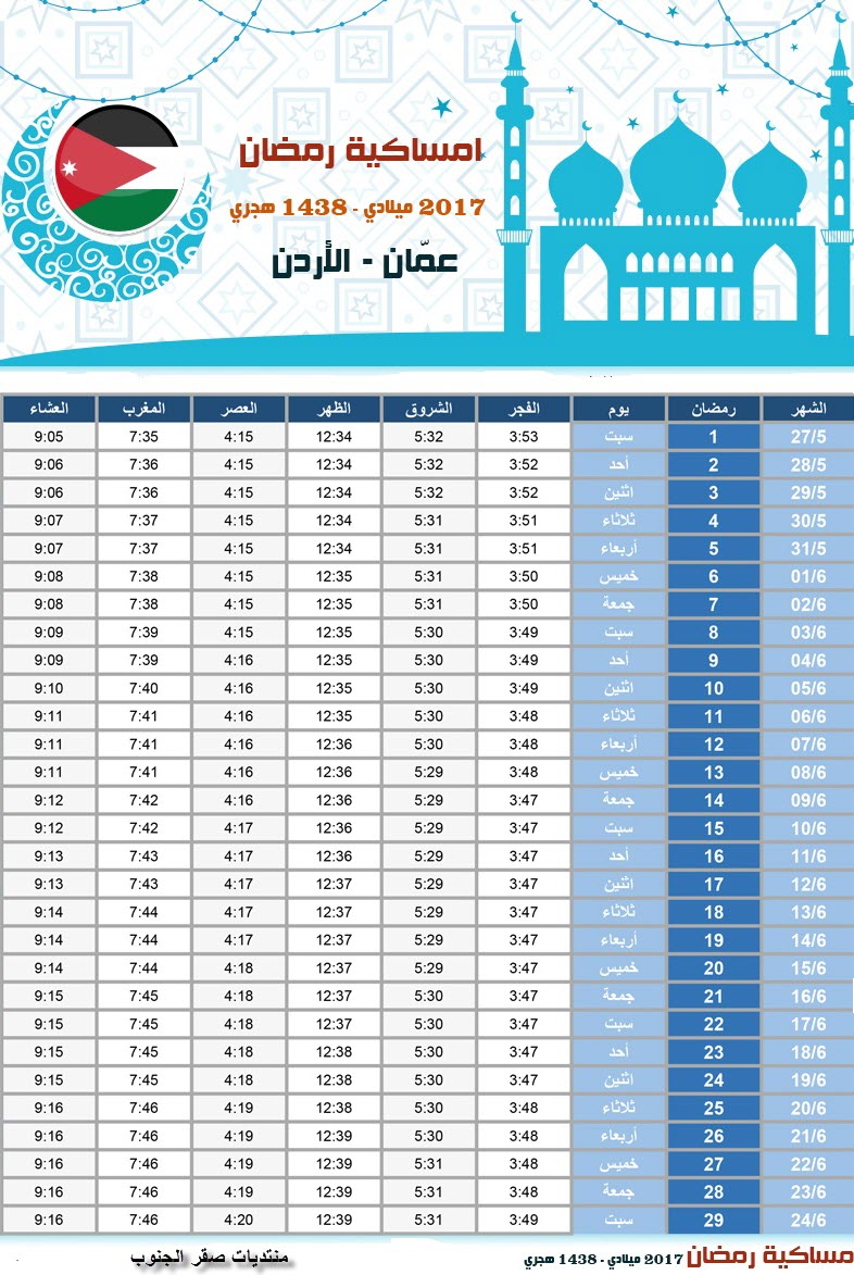 امساكية شهر رمضان المبارك في المملكة الاردنية الهاشمية للعام 2017 1438 منتديات صقر الجنوب