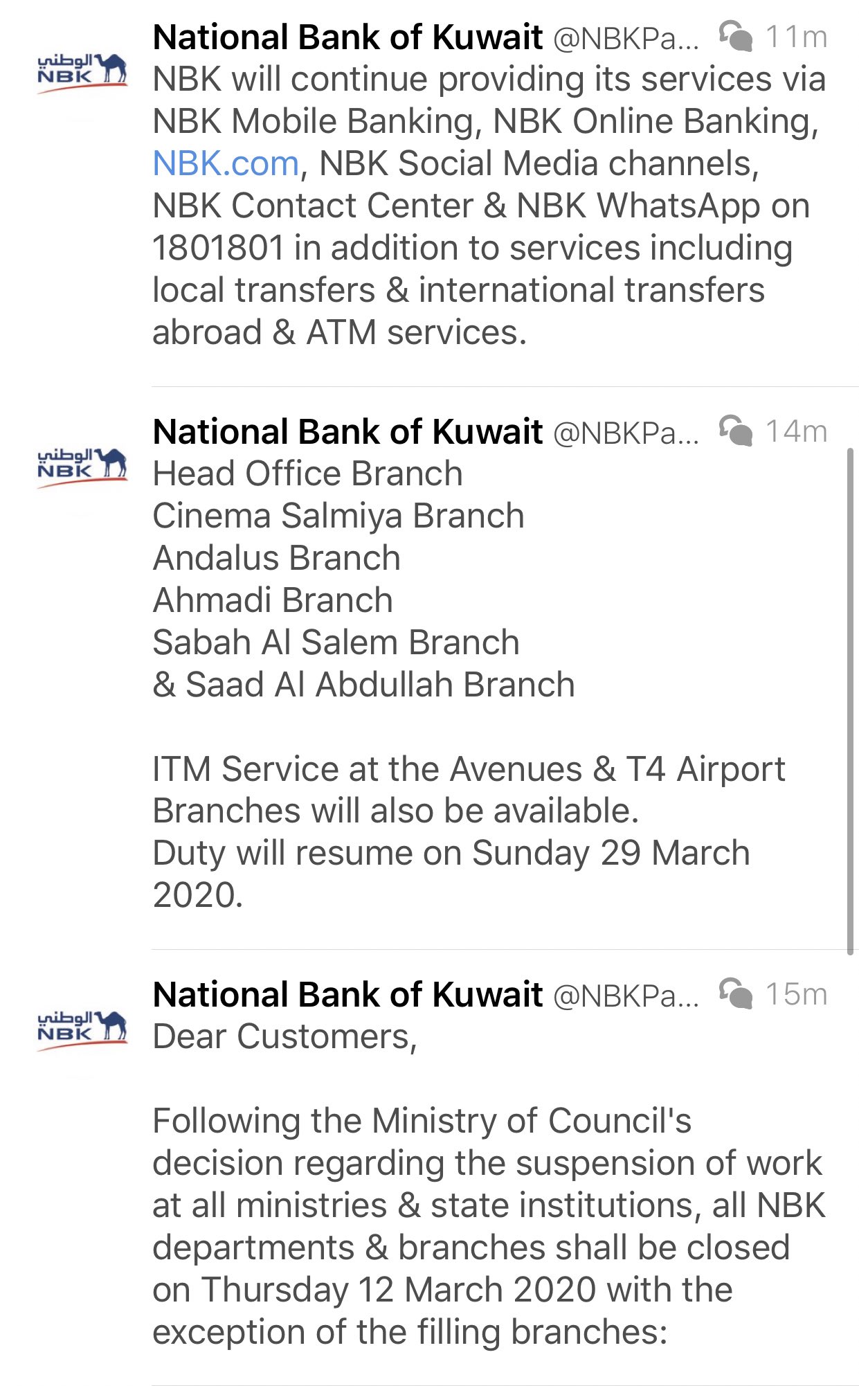 المجلس On Twitter Nbk Dear Customers We Continue Providing Itm Services At The Filling Branches Head Office Branch Cinema Salmiya Branch Andalus Branch Ahmadi Branch Sabah Al Salem Branch Saad Al