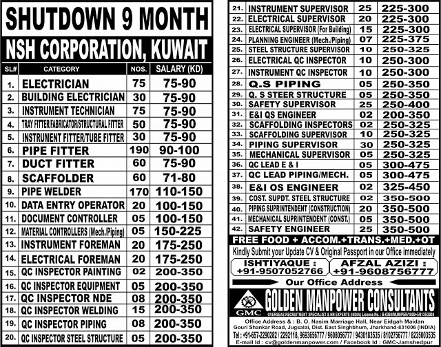 Gulf Naukri Wanted For Nsh Corporation Co Kuwait 9 Month Shutdown Project