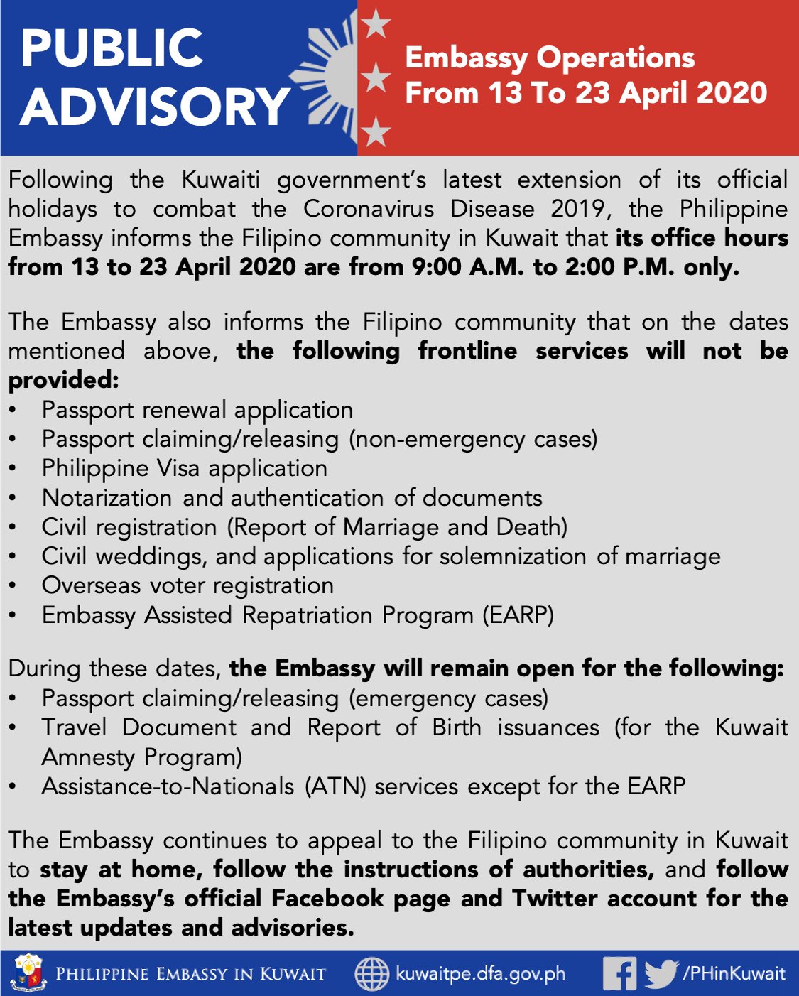 Philippine Embassy In Kuwait On Twitter Public Advisory Philippine Embassy Operations From 13 To 23 April 2020 In English And Filipino Https T Co X6p8j7rphe Visit The Embassy S Covid 19 Webpage Https T Co Oyfiik8zlz Covid19 Ncov