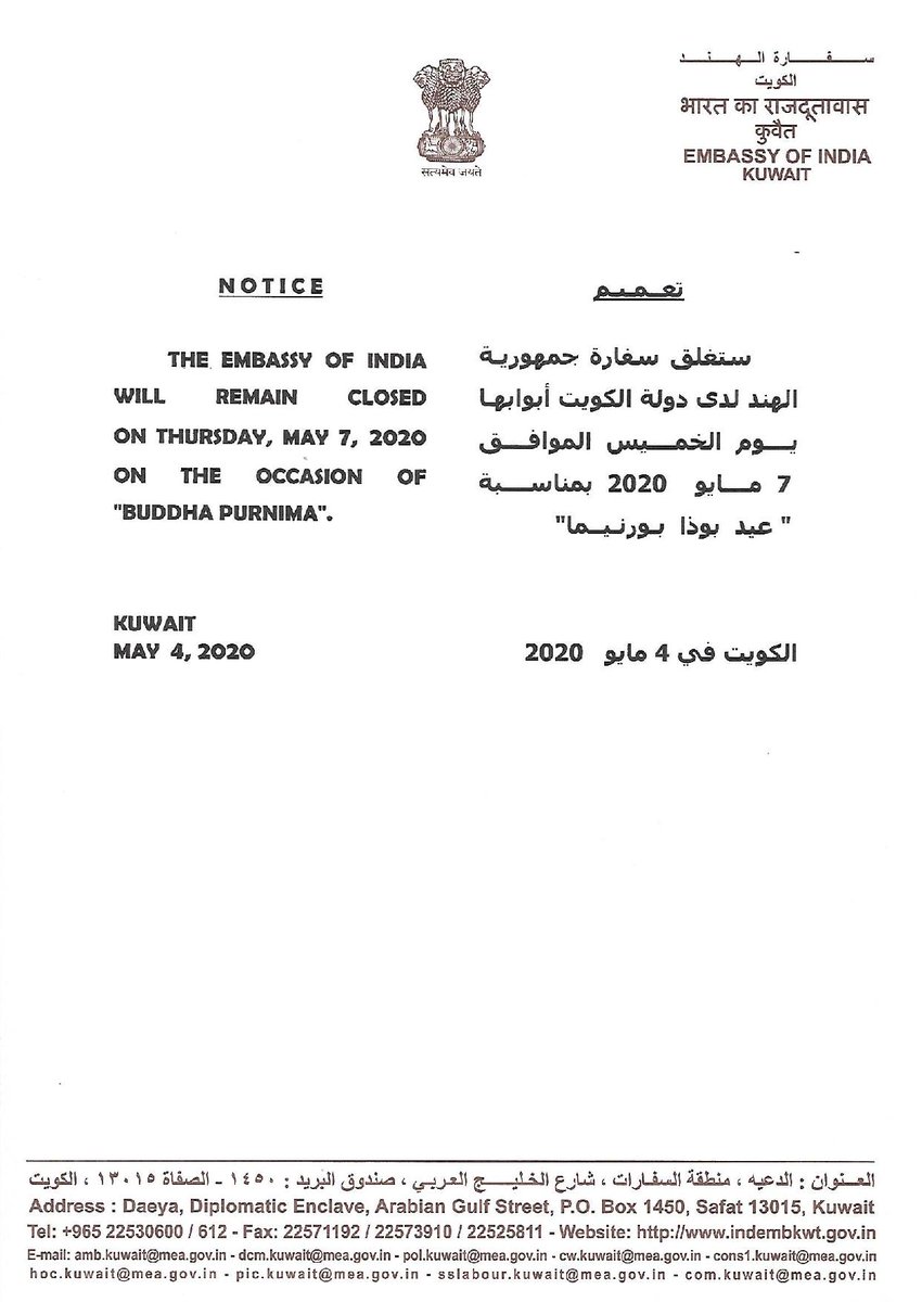 India In Kuwait On Twitter Notice The Embassy Of India Shall Remain Closed On Thursday 7th May 2020 On The Occasion Of Buddha Purnima However Emergency Consular Services Will Be Rendered By