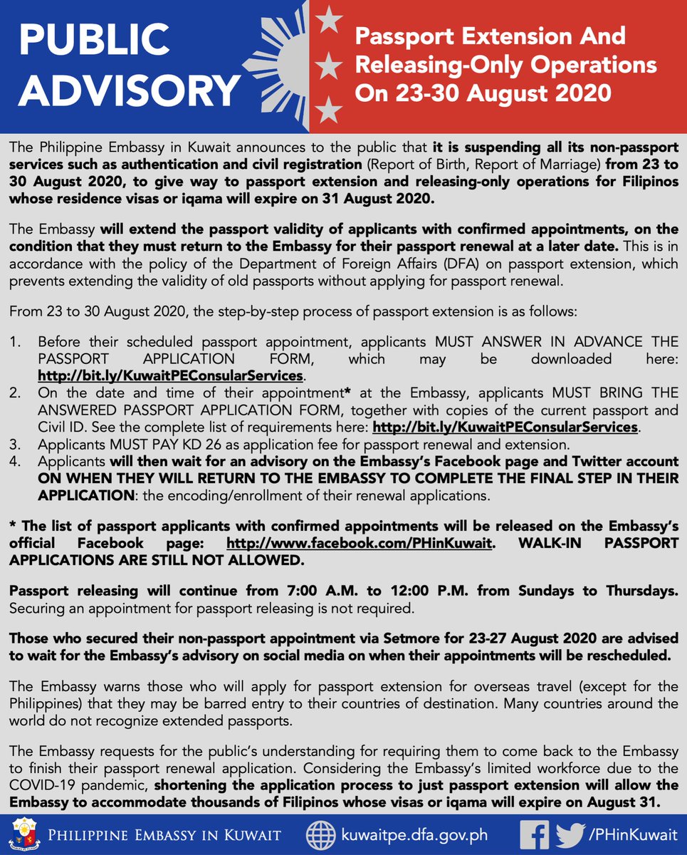 Philippine Embassy In Kuwait On Twitter Kabayan We Hear You Public Advisory Passport Extension And Releasing Only Operations On 23 30 August 2020 In English And Filipino Https T Co Cnkhzhtlqo Safereopening Newnormal Phinkuwait Https T Co