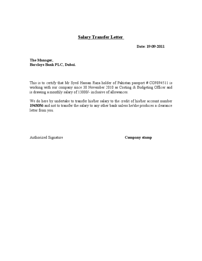 Salary Transfer Letter Format Sample Request Letters