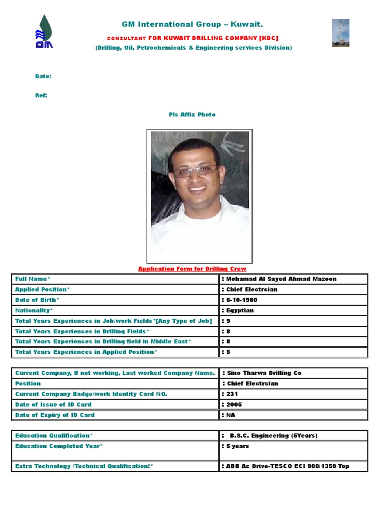 Gm Kdc Prescribed Cv Application Form Drilling Crews Consultant For Kuwait Drilling Company 1 Identity Document Electrician