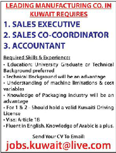 Jobs In Kuwait Accountant Sales Executive Needed For Manufacturing Co In Kuwait